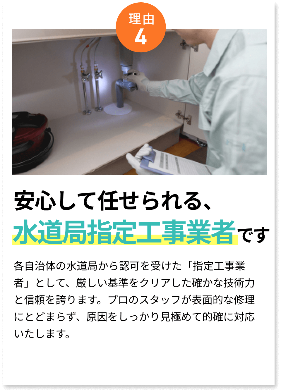 水道局から正式に認可された「水道局指定工事事業者」は、技術・対応の信頼性が保証された証です。